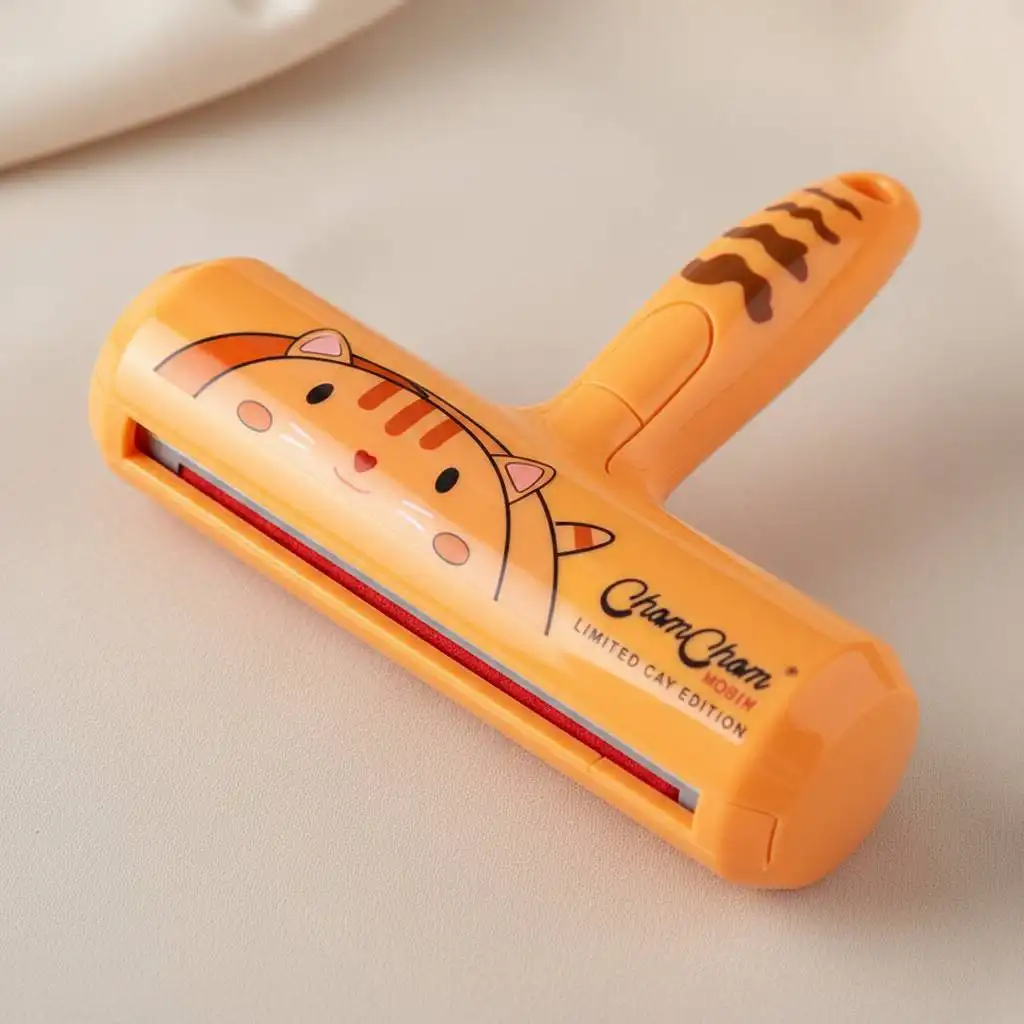 Macro shot of an orange glossy cat-themed pet hair remover roller featuring red velvet strips and a grey rubber squeegee on beige fabric.